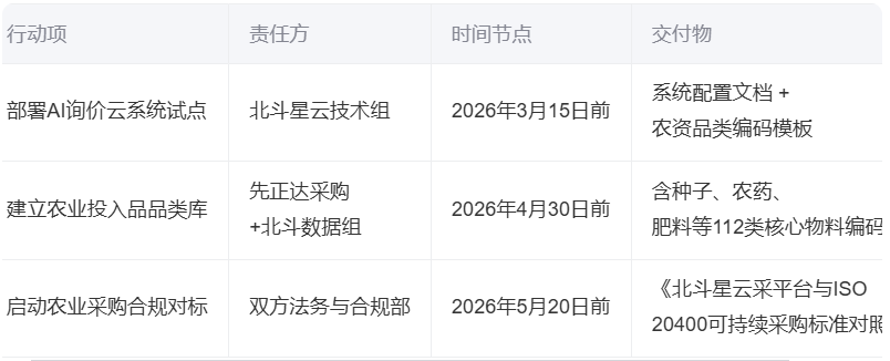 本次回访标志着北斗星云采平台在农业科技采购数字化领域实现关键突破。先正达作为全球农业领军企业,其对AI询价云“符合国际标准”的高度认可,验证了平台在高合规、强韧性、重溯源的农业供应链采购场景中具备不可替代的专业能力。采购效率提升98.7%、成本降低超15%、库存积压减少60%、全流程100%可追溯——这些数据不仅是技术指标,更是企业实现粮食安全、绿色采购与全球供应链协同的实证基石。下一步将以此为标杆,加速复制至全球农化与食品原料采购网络。